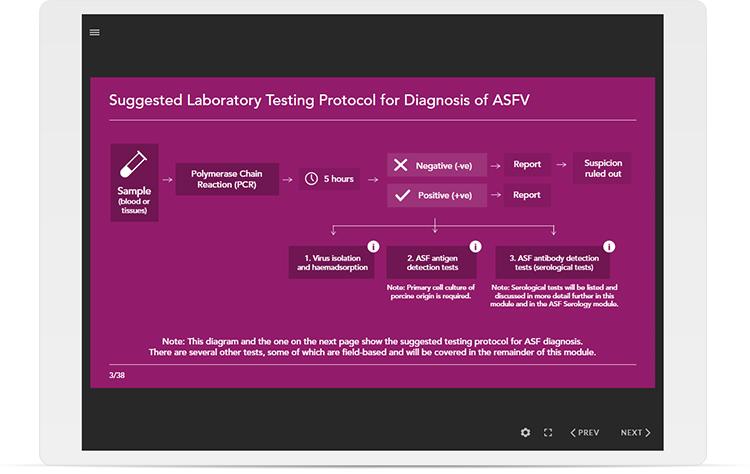 This eLearning course designed in collaboration with subject matter experts in the ASFV WOAH reference laboratory at Pirbright, is intended to broaden participants understanding of ASF, and the virus which causes it. The course specifically focuses on information that would be useful for vets or laboratory staff undertaking laboratory diagnostic testing of ASFV.