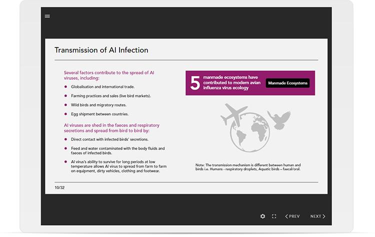 This eLearning course designed in collaboration with subject matter experts conducting research on avian influenza at Pirbright, is intended to broaden participants understanding of avian influenza, and the virus which causes it. The course specifically focuses on information that would be useful for laboratory staff undertaking laboratory diagnostic testing of AIV.