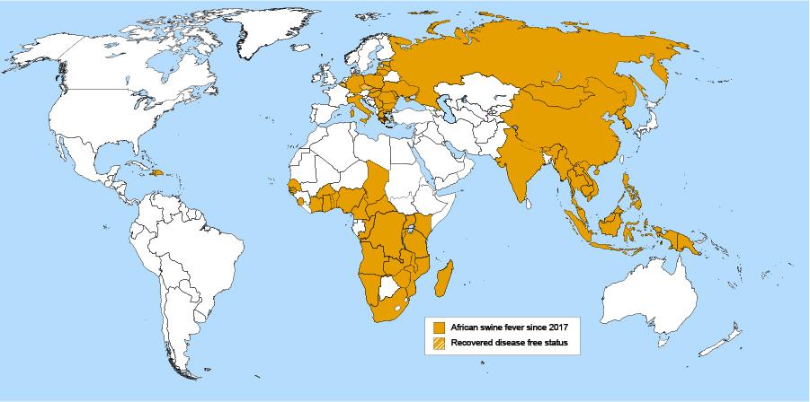 World map to show the presence of African swine fever (data from the World Organisation for Animal Health (WOAH))