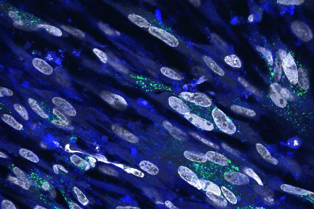 Image shows cholesterol (blue) and MDV glycoprotein B (green) in infected cells in the presence of a cholesterol inhibitor. Nuclei are shown in white.