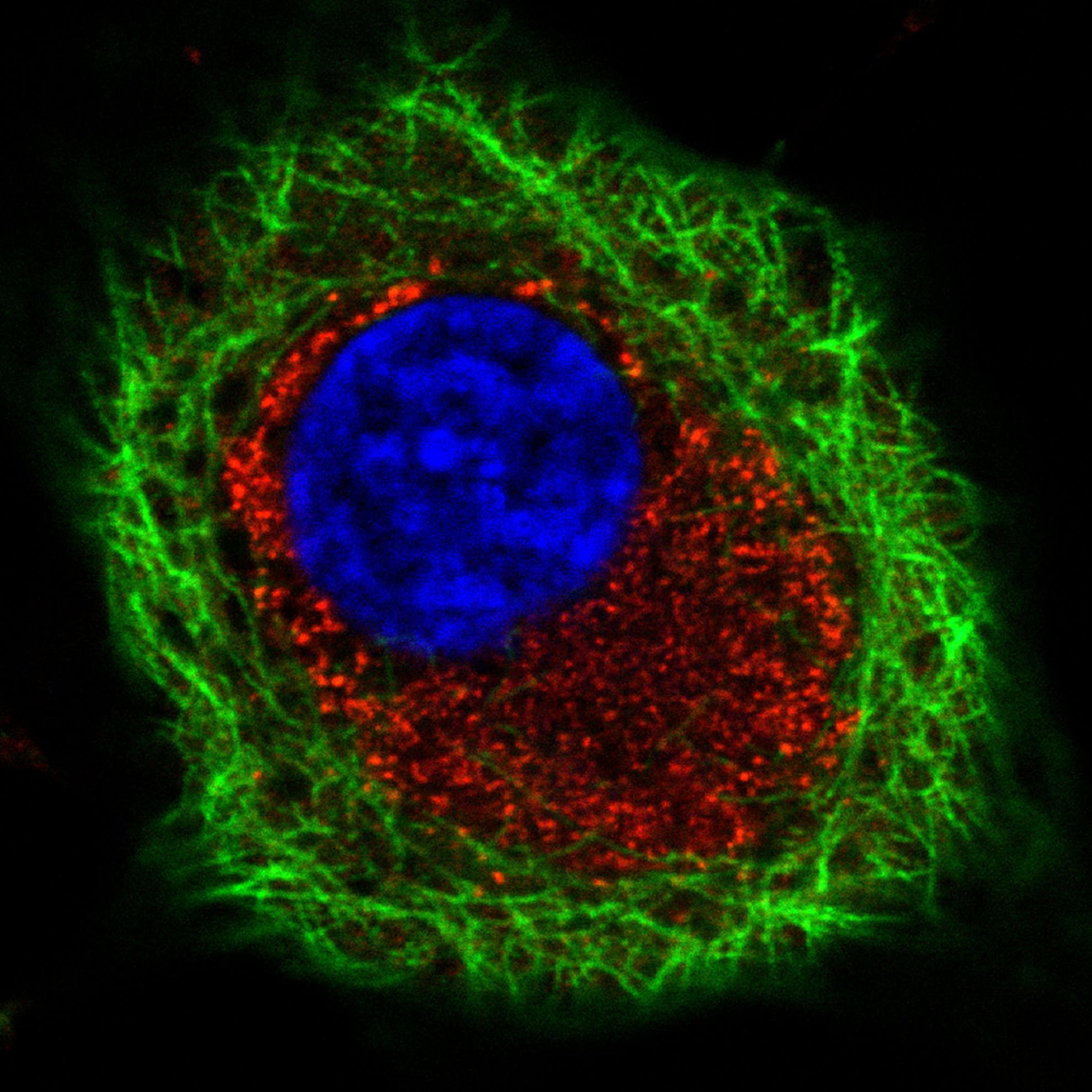 Image caption: foot-and-mouth disease virus infected cell, the virus is seen in red.