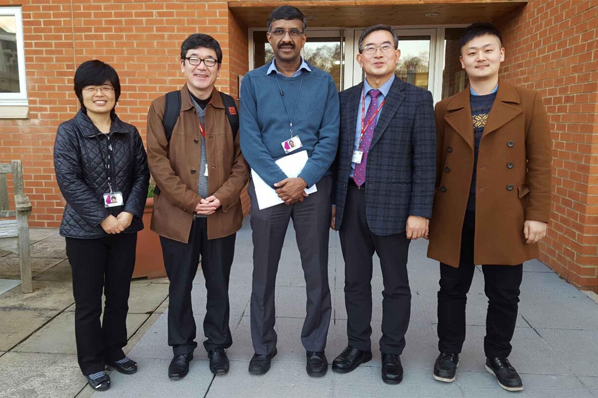 (Picture shows Prof. Nair and Prof. Han (centre) at The Pirbright Institute, with members of their respective research teams.)