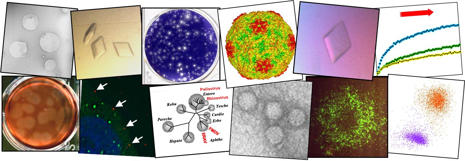 The picornavirus family of viruses includes a number of important pathogens of animals and humans, for example foot-and-mouth disease virus (FMDV), poliovirus and human rhinovirus (the common cold). We are interested in picornavirus cell entry, replication, assembly, structure, antigenicity and evolution.
