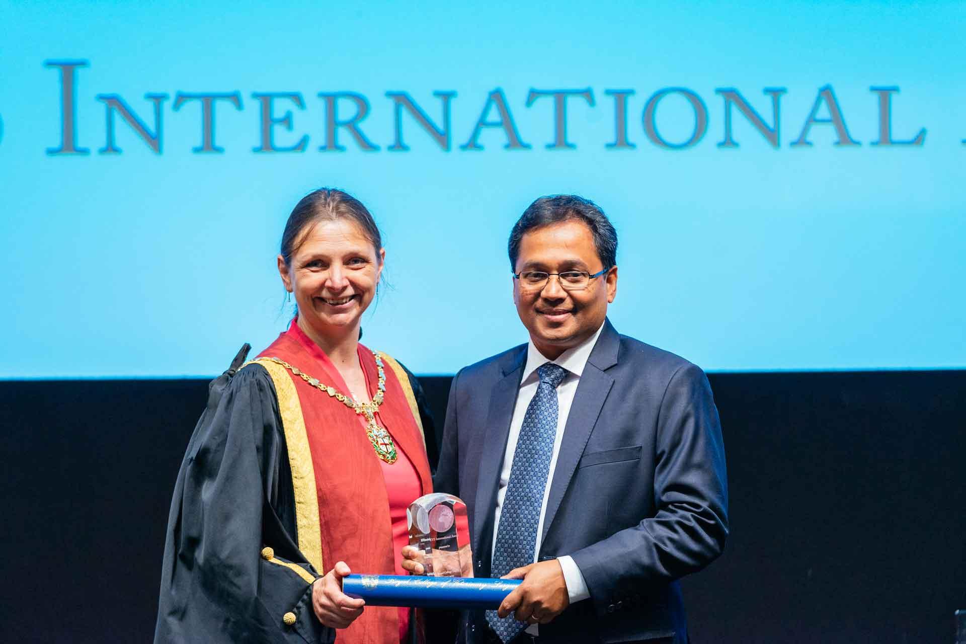 Image: Dr Thevasagayam receiving the RCVS International Award from President Amanda Boag on Friday 12 July 2019.